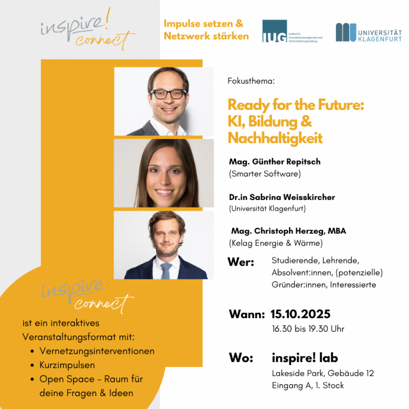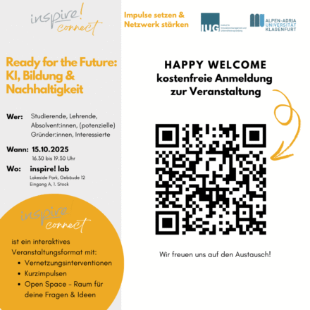 Das beliebte Veranstaltungsformat inspire! connect wird es auch im Wintersemester wieder geben! Zum Auftakt widmen wir uns dem Thema »Ready for the Future: KI, Bildung und Nachhaltigkeit« – und stellen die Frage, wie wir Künstliche Intelligenz verantwortungsvoll, kreativ und zukunftsorientiert einsetzen können.